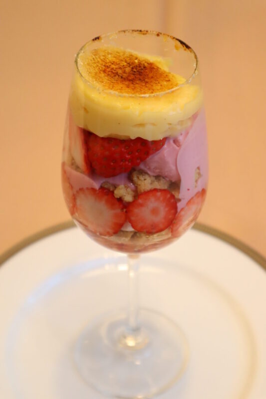 キャラメリゼした香ばしいブリュレから始まり、ストロベリーアイスクリームとバニラアイスクリーム、ザクザク感が楽しめるクランブルなど満足感たっぷりのパフェ。