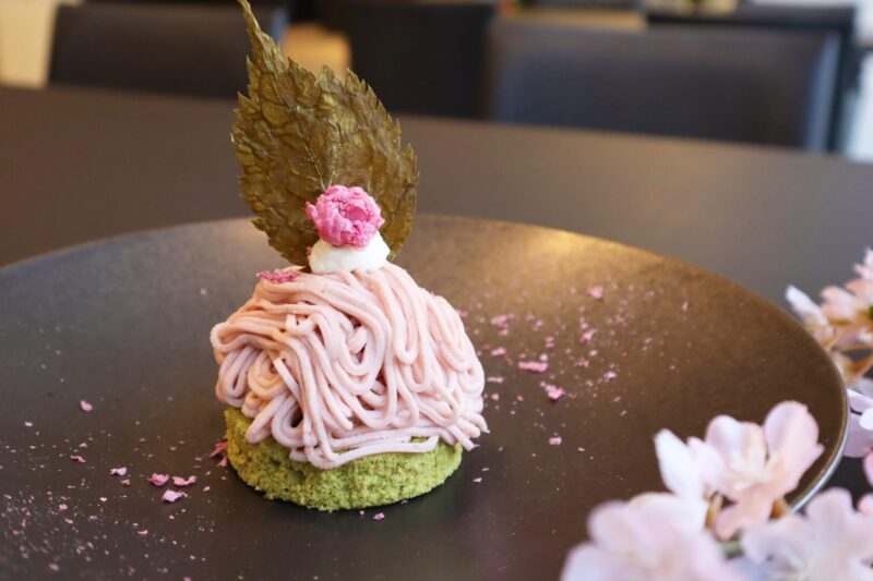 抹茶のスポンジケーキにあんこを重ね、中には苺を丸ごと1粒。パリパリで塩味のある桜の葉を崩して、桜餡たっぷりの甘いモンブランと、一緒にお召し上がりください。
