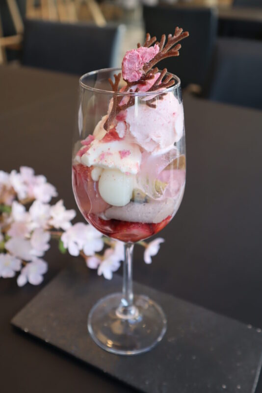 桜風味のパンナコッタに抹茶のラスク、白玉や桜ゼリーなどを贅沢に重ねた桜と和の味わいが調和するパフェ。