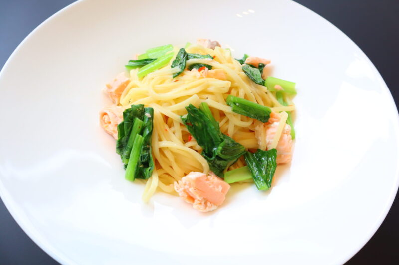 パスタビアンコ:小松菜とサーモンのペペロンチーノ