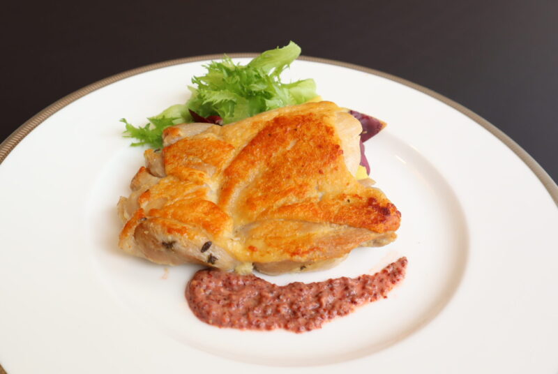 今月は「鶏もも肉のコンフィ カシスマスタード添え」です。フランスの伝統的な調理法、コンフィ。塩に漬け込むことで旨味を閉じ込めた鶏肉を、ニンニク、オリーブオイルでじっくりと時間をかけて焼き上げました。タイム、ローリエに加えスパイスがさらに味を引き立てます。酸味の効いたカシスが香るマスタードソースでお楽しみください。