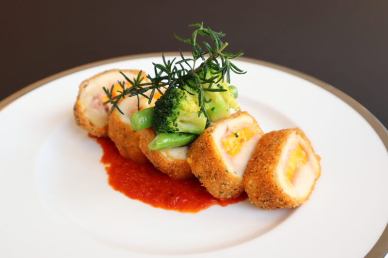 今月は「コルドンブルー」です。薄く叩き伸ばした鶏むね肉で、モッツアレラとチェダーをブレンドしたマーブルチーズ、生ハムを包み、香ばしく焼き上げました。